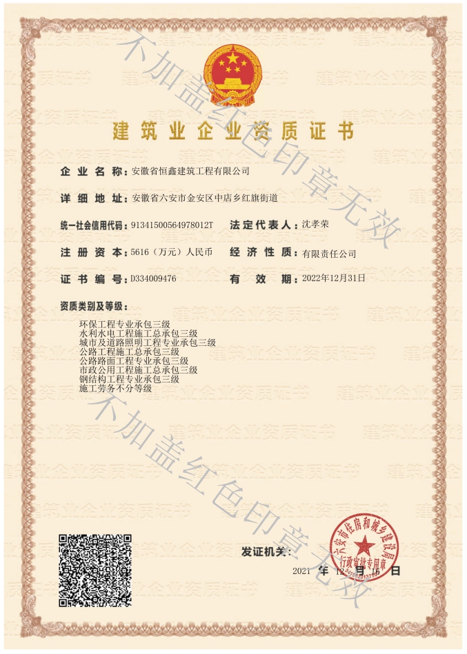 公司目前主要的資質范圍:建筑工程施工總承包二級,市政公用工程總承包三級、水利水電工程施工總承包三級,公路工程施工總承包三級;建筑裝修裝飾工程專業承包二級,電子與智能化工程專業承包二級、建筑幕墻工程專業承包二級,城市及道路照明專業承包三級、鋼結構工程專業承包三級,公路路面工程專用承包三級。